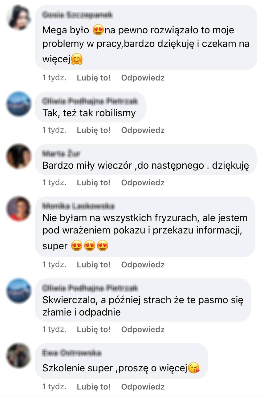 Jestem fryzjerem z zawodu i ogromną pasjonatką włosów i tego, co możemy z nich stworzyć. Pracuję aktywnie przez cały ten okres, biorę udział w wielu inspirujących sesjach zdjęciowych, pokazach, eventach. Uczesałam już setki Panien Młodych, tysiące gości weselnych. Wiele nauczyłam się na własnych błędach, przetestowałam całą masę technik i kosmetyków, aby wyselekcjonować dla Ciebie te najefektywniejsze i najbardziej przydatne w naszej codziennej pracy. Dziś chcę Ci je przekazaćwraz z całym pakietem wiedzy i będzie mi bardzo miło jeśli zechcesz to wszystko przyjąć.